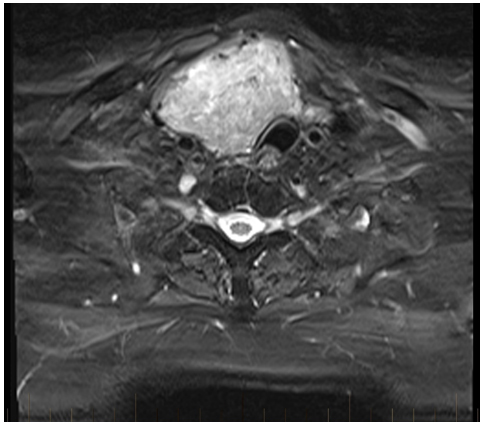 Figure 2. Large goitre causing tracheal deviation and a crescent trachea (MRI)