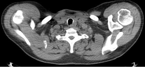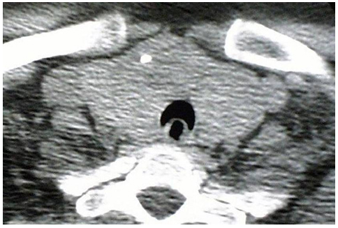 Figure 4. Pre-operative CT scan of the neck demonstrating crescent trachea sign