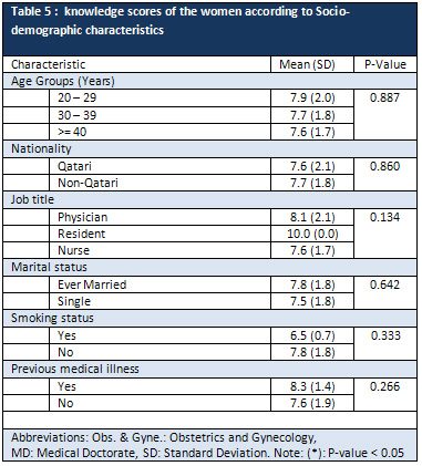 Table 5 shows the relation between knowledge score and sociodemographic factors revealing that no significant test results were found.