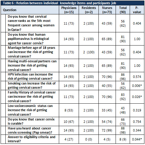 Furthermore, this study found a relation between individual knowledge items and participants' job revealing that there is significant test results related to (Smoking, and Family History) mainly in the residents which reaches 100% compared to physicians and nurses, while eligibility criteria was significant among physicians 27% compared to 5% among nurses. Those findings make us think more of nurse education and training on the topic of cervical cancer screening.