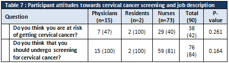 Table 7 shows the participants' attitudes towards cervical cancer screening and job description revealing no significant test results found.